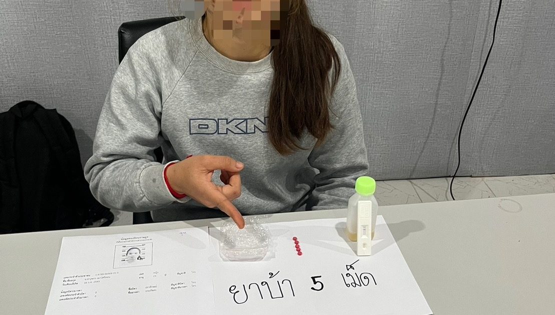 ของกลาง - ยาบ้าชนิดเม็ดกลมแบนสีแดง ประทับอักษร WY จำนวน ๕ เม็ด ห่อหุ้มอยู่ในเศษถุงพลาสติก ซุกซ่อนอยู่ในกระเป๋าสะพายข้างสีดำ ภายในห้องพัก
