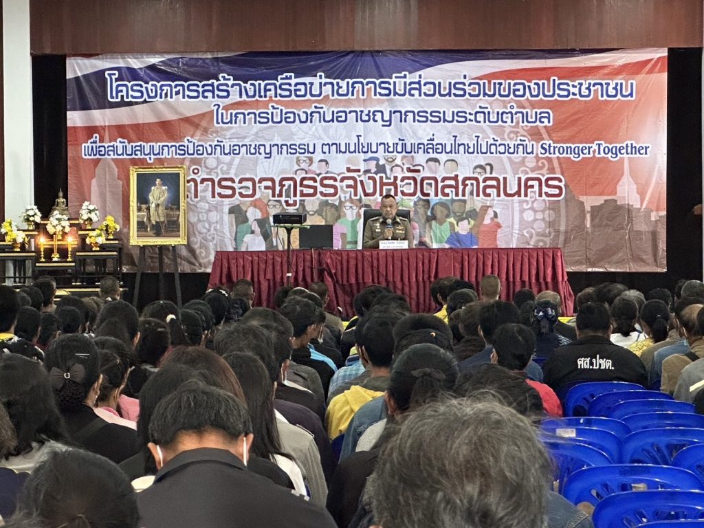 วันที่ 29 พ.ย.2566 เวลา 09.00 น. พล.ต.ต.สมจิตร เหล่ามลคลนิมิต ผบก.ภ.จว.สกลนคร มอบหมายให้ พ.ต.อ.โชคชัย อินทะนิน รอง ผบก.ภ.จว.สกลนคร เป็นประธานในพิธีเปิดโครงการอบรมสร้างเครือข่ายการมีส่วนร่วมของประชาชนในการป้องกันอาชญากรรมระดับตำบล ตำรวจภูธรจังหวัดสกลนครประจำปีงบประมาณ พ.ศ. ๒๕๖๗ พร้อมด้วย พ.ต.อ.เศกสรร สุขประเสริฐ รอง ผบก.ภ.จว.สกลนคร และ พ.ต.อ.สุริยา ชาโพธิ์เนตร ผกก.(สอบสวน)ฯ พ.ต.อ.ชัชวาลย์ ดวงแก้ว ผกก.สภ.เมืองสกลนคร, พ.ต.อ.สุรพล ปาระคะ ผกก.สภ.โคกศรีสุพรรณ, พ.ต.อ.พีรเดช เจริญเดช ผกก.สภ.ตาดโตน, พ.ต.อ.กิตติ แก้วทินกร ผกก.สภ.เต่างอย, พ.ต.ท.พินิจ เขตสกุล สวญ.สภ.สร้างค้อ, พ.ต.ท.ภาสกร หนุดตะแสง สว.สภ.ดงมะไฟ, ข้าราชการตำรวจฝ่ายอำนวยการ ภ.จว.สกลนคร และผู้เกี่ยวข้องร่วมพิธีเปิดโครงการฯ มีผู้เข้ารับการอบรม รวม ๕๕๐ คน ณ หอประชุมถนอมจันทร์เปล่ง กก.ตชด.๒๓ อ.เมืองสกลนคร จว.สกลนคร