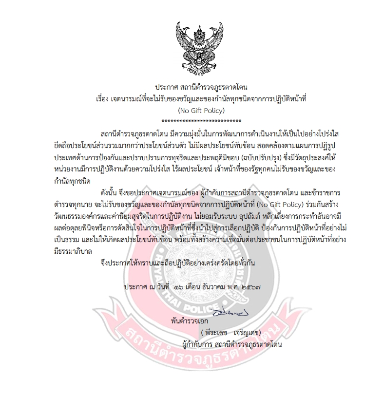 เมื่อวันที่ 9 มกราคม 2568 เวลา 10.00 น.พ.ต.อ.พีระเดช เจริญเดช ผกก.สภ.ตาดโตน พร้อมข้าราชการตำรวจในสังกัด ร่วมประกาศเจตนารมณ์ที่จะไม่รับของขวัญและของกำนัลทุกชนิดจากการปฏิบัติหน้าที่ (No Gift Policy)