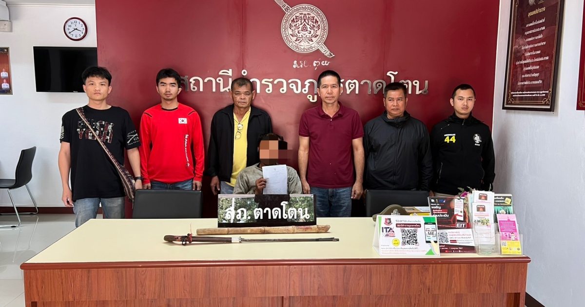 พร้อมด้วยของกลาง - อาวุธปืนแก๊ปพานท้ายสั้น ( แบบไทยประดิษฐ์ )จำนวน 1 กระบอก พบวางไว้อยู่ที่พื้นดินห่างจากเพิงพักที่เกิดเหตุประมาณ 10 เมตร